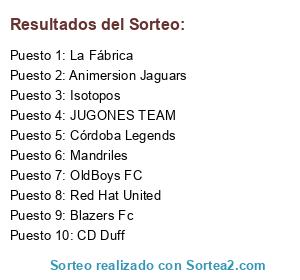 Lista de participantes: Red Hat United, Mandriles, Animersion Jaguars, Blazers Fc, Isotopos, OldBoys FC, CD Duff, La Fábrica, Córdoba Legends, JUGONES TEAM.