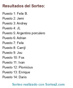 Lista de participantes: Jou, Andrey, Felix B., Enrique, Adrian, Argentino porculero, JL, Dario, Fox, Jemi, Felix, Carrijl, Ivan, Plomicius.