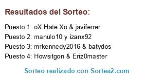 Lista de participantes: oX Hate Xo & javiferrer, Howsitgon & Eriz0master, mrkennedy2016 & batydos, manulo10 y izanx92.