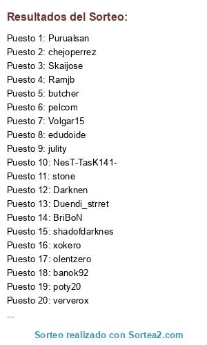 Lista de participantes: xokero, Skaijose, stone, guti, poty20, edudoide, pelcom, olentzero, Bruck, Dalex, Darknen, NesT-TasK141-, ververox, Duendi_strret, shadofdarknes, butcher, Volgar15, julity, Purualsan, darthcoli, chejoperrez, Ramjb, banok92, BriBoN.