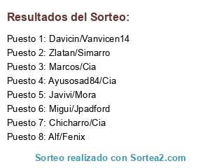 Lista de participantes: Davicin/Vanvicen14, Migui/Jpadford, Javivi/Mora, Zlatan/Simarro, Alf/Fenix, Marcos/Cia, Ayusosad84/Cia, Chicharro/Cia.