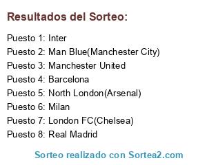 Lista de participantes: London FC(Chelsea), Manchester United, Barcelona, Inter, Milan, Real Madrid, North London(Arsenal), Man Blue(Manchester City).