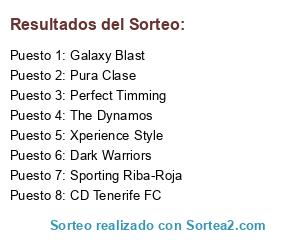 Lista de participantes: Pura Clase, The Dynamos, CD Tenerife FC, Sporting Riba-Roja, Dark Warriors, Perfect Timming, Xperience Style, Galaxy Blast.