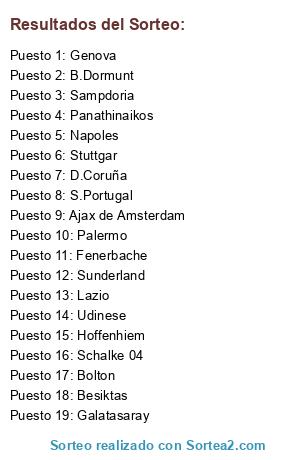 Lista de participantes: Napoles, Lazio, B.Dormunt, Stuttgar, D.Coruña, Fenerbache, Palermo, Panathinaikos, S.Portugal, Sunderland, Genova, Bolton, Udinese, Ajax de Amsterdam, Besiktas, Hoffenhiem, Galatasaray, Sampdoria, Schalke 04.