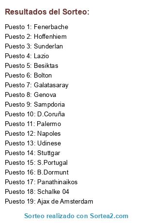 Lista de participantes: Napoles, Lazio, D.Coruña, B.Dormunt, Fenerbache, Palermo, Panathinaikos, Stuttgar, S.Portugal, Sunderlan, Genova, Bolton, Besiktas, Sampdoria, Udinese, Galatasaray, Hoffenhiem, Schalke 04, Ajax de Amsterdam.