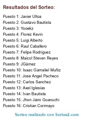 Lista de participantes: JGámez, Jhon Jairo Guanuchi, Cristian Corimayo, Javier Ulloa, Maicol Steven Reyes, Florez Kevin, Ivan Bautista, Felipe Rodriguez, Luigi Alberto, Carlos Sanchez, Axel Iglesias, Gustavo Bautista, Isaac Gamaliel Muñiz, Raul Caballero, Yooekz, Jose Angel Pacheco.
