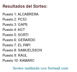 Lista de participantes: AGT, ALCABRERA, EL PAPI, GAPS, GERARDO, KAMARC, PC53, RAUL, SAMUELSSON, SORTI.
