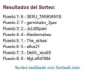 Lista de participantes: 1 - The_eckae, 2 - JuLi0Spain, 3 - DeViL_xou69, 4 - Alexbernabeu, 5 - elfus21, 6 - SERJ_TANKIAN18, 7 - germinator_2pac, 8 - MyLoRd1984.