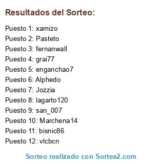 Lista de participantes: lagarto120, enganchao7, xamizo, Alphedo, bisnic86, Jozzia, Marchena14, Pasteto, vlcbcn, fernanwall, grai77, san_007.