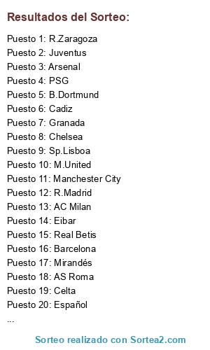 Lista de participantes: Malaga, Sevilla, Eibar, Deportivo, R.Madrid, At.Madrid, AS Roma, Granada, Sporting, Sp.Lisboa, PSG, Almeria, Mirandés, Cordoba, Celta, M.United, Manchester City, Alavés, Liverpool, AC Milan, Arsenal, Cadiz, O.Lyon, Las Palmas, Real Betis, Español, Chelsea, Barcelona, B.Dortmund, R.Valladolid, R.Zaragoza, Juventus.