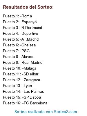 Lista de participantes: -PSG, -Milan, -Liverpool, -Villareal, -Torino, -Malaga, -Barcelona, -At.Madrid.