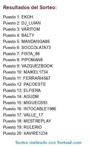 Lista de participantes: PIPOMAN8, INTOCABLE1986, PACOESTE, MESTREPLAY, MANDANGA86, FISTA_88, MIGUECS93, EKOH, RULERIO, XAVIRE1234, AGUDM, VALLE_17, BALTY, SOCCOLATA73, MAIKEL1734, VAZQUEZBOOK, DJ_LUIAN, VARITOM, ELFIERA, FERRARI4567.