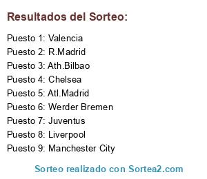 Lista de participantes: Valencia, Manchester City, Juventus, Werder Bremen, Chelsea, R.Madrid, Liverpool, Ath.Bilbao, Atl.Madrid.