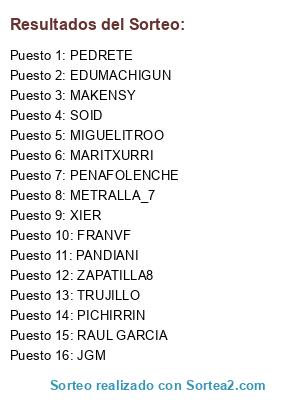 Lista de participantes: XIER, FRANVF, RAUL GARCIA, MARITXURRI, MIGUELITROO, JGM, TRUJILLO, PENAFOLENCHE, EDUMACHIGUN, ZAPATILLA8, METRALLA_7, SOID, PICHIRRIN, PEDRETE, MAKENSY, PANDIANI.