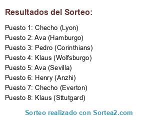 Lista de participantes: Ava (Sevilla), Klaus (Wolfsburgo), Pedro (Corinthians), Checho (Lyon), Henry (Anzhi), Checho (Everton), Ava (Hamburgo), Klaus (Sttutgard).