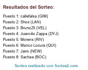Lista de participantes: Bruno25 (VEL), Manco Locura (QUI), Morens (RIV), Shox (LAN), callefalsa (GIM), Sachaa (BOC), Juancito Zappa (DYJ), Jairo (NEW).