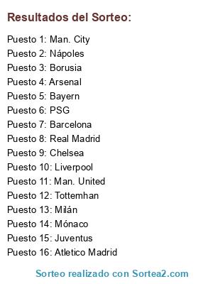Lista de participantes: Real Madrid, Atletico Madrid, Barcelona, Arsenal, Man. City, Man. United, Tottemhan, Liverpool, Chelsea, PSG, Monaco, Milan, Juventus, Napoles, Bayern, Borusia.