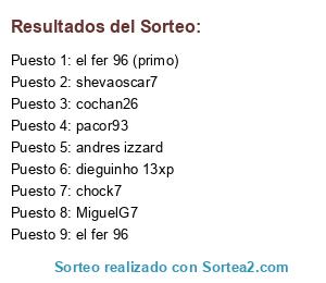 Lista de participantes: el fer 96, el fer 96 (primo), shevaoscar7, cochan26, pacor93, andres izzard, dieguinho 13xp, chock7, MiguelG7.