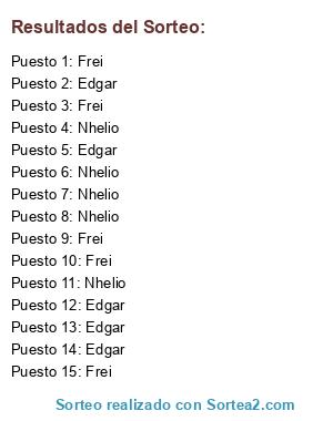 Lista de participantes: Edgar, Edgar, Edgar, Edgar, Edgar, Nhelio, Nhelio, Nhelio, Nhelio, Nhelio, Frei, Frei, Frei, Frei, Frei.