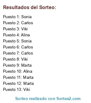 Lista de participantes: Carlos, Viki, Alina, Sonia, Marta, Carlos, Viki, Alina, Sonia, Marta, Carlos, Viki, Alina, Sonia, Marta.
