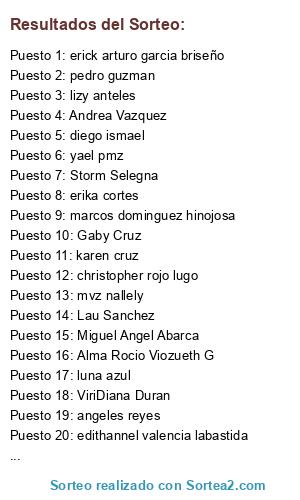 Lista de participantes: Adriana Hg , adrii flores , aida hernandez lozano , aldo jovanny , alee soto , alejandra lugo , alin lopez , Alma Rocio Viozueth G , amaury ibarra , Andrea Vazquez , andy quijas , angeles reyes , anna anma , arodriguez vra , ary vega , beatriz murrieta parra , Caro Alvarez , celic santacruz castañeda , charly flozuñiga , christopher rojo lugo , Claudia Pacheco , consuelo loria mena , daniel chavez garcia , daniel perez , dany nava andrade , Diana Acosta , diego gonzalez , diego ismael , dulce bhern , edithannel valencia labastida , edyliz rimon , eh marianita , erick arturo garcia briseño , erick matias , erika cortes , erika cruz monroy , Gaby Cruz , gen olvera , Gini Resendiz , guillermo angeles , Irving Gress , itzel perez , jasso elizabeth , jesus alvarez , jesus cantu olivares , jonathan muñoz ponce , jovanny ramirez garcia , julio RG , karen cruz , karen marquez , karen tellez , Lau Sanchez , lbk vintagge , lizy anaya , lizy anteles , lucio voreno , luis angel olvera granados , luna azul , marcos dominguez hinojosa , Mary IsHer , mary marui , maty espacer , mauricio perez , May Lop , Miguel Angel Abarca , Mimis Arreguin , mvz nallely , nenita cherry , oguer garcia , omar GH , paola CG , Patricia Samperio Aviles , pedro guzman , rudy ortega , Samantha Santacruz , sarahid priego lex , sari alhe , stephanye cas , Storm Selegna , Tom Montoya Carrasco , vanessa telez giron , ViriDiana Duran , yael pmz , yesy ca , yudi cersa.
