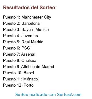 Lista de participantes: Juventus, Mónaco, Atlético de Madrid, Real Madrid, PSG, Barcelona, Porto, Bayern Múnich, Manchester City, Chelsea, Arsenal, Basel.