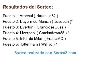 Lista de participantes: Bayern de Munich ( Josebari )*, Tottenham ( Willitio ) *, Liverpool ( Crackndown88 ) *, Everton ( GrandioseGuss ), Arsenal ( Naranjito82 ), Inter de Milan ( FranciMC ).