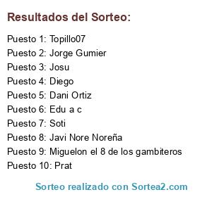 Lista de participantes: Diego, Soti, Dani Ortiz, Edu a c, Javi Nore Noreña, Miguelon el 8 de los gambiteros, Jorge Gumier, Topillo07, Josu, Prat.
