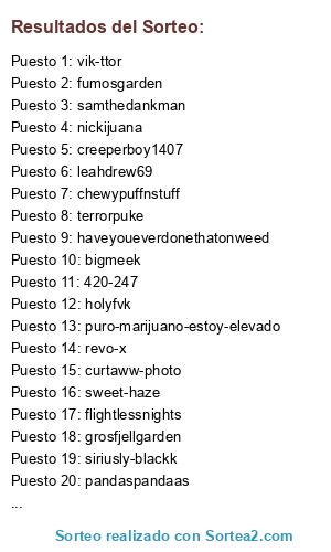 Lista de participantes: leahdrew69, nitemareglitch, tedisabear, sweet-haze(2 participaciones), steezersmind, creeperboy1407(3 participaciones), curtaww-photo(2 participaciones), revo-x(4 participaciones), your-neverending-sunshine, grosfjellgarden, samthedankman, ilovekarsimbuccexdxd, pandaspandaas, terrorpuke, slobohamon, laurajuana420, jeremythestoner, siriusly-blackk, flightlessnights, liftedhighdeas, pacingthroughthestars, haveyoueverdonethatonweed, dontjuggmebro(2 participaciones), squirtletits(2 participaciones), fumosgarden(10 participaciones), sagekuma, danieldabs, 420-247(10 participaciones), luciferslilhelper(6 participaciones), thedegenerategoat, handblown-homegrown, passionateaboutpot, chewypuffnstuff(2 participaciones), vik-ttor(5 participaciones), smokewithouthaste(2 participaciones), bigmeek, holyfvk, um-viciado-em-crise, nickijuana(6 participaciones), puro-marijuano-estoy-elevado(10 participaciones).