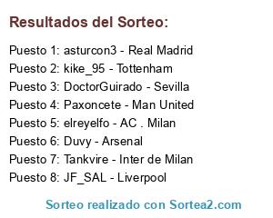 Lista de participantes: JF_SAL - Liverpool, DoctorGuirado - Sevilla, elreyelfo - AC . Milan, asturcon3 - Real Madrid, kike_95 - Tottenham, Tankvire - Inter de Milan, Duvy - Arsenal, Paxoncete - Man United.