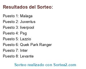 Lista de participantes: Lazzio, Inter, Psg, Juventus, liverpool, Malaga, Quek Park Ranger, Levante.