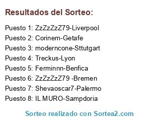 Lista de participantes: Treckus-Lyon, Shevaoscar7-Palermo, Ferminnn-Benfica, IL MURO-Sampdoria, Corinem-Getafe, moderncone-Sttutgart, ZzZzZzZ79-Liverpool, ZzZzZzZ79 -Bremen.