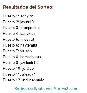 Lista de participantes: alead71, javinr10, viuso x, jordicor, borracheras, javilenti123, finestrat, kapykua, haytemita, adrlylito, inducenando, trompexbox.