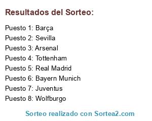 Lista de participantes: Real Madrid, Bayern Munich, Tottenham, Arsenal, Juventus, Sevilla, Barça, Wolfburgo.