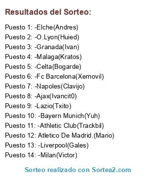 Lista de participantes: Atletico De Madrid.(Mario), -Granada(Ivan), -Napoles(Clavijo), -Milan(Victor), -Malaga(Kratos), -Athletic Club(Trackbil), -Bayern Munich(Yuh), -Celta(Bogarde), -O.Lyon(Huied), -Elche(Andres), -Fc Barcelona(Xernovil), -Ajax(Ivancit0), -Lazio(Txito), -Liverpool(Gales).