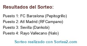 Lista de participantes: Sevilla (Dankobi), Atl Madrid (RFCampano), FC Barcelona (Pepitogrillo), Rayo Vallecano (Nalo).