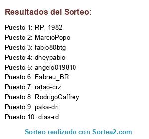 Lista de participantes: RodrigoCaffrey, MarcioPopo, dias-rd, Fabreu_BR, fabio80btg, ratao-crz, paka-dri, angelo019810, dheypablo, RP_1982.