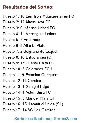 Lista de participantes: 1 Straight Edge, 2 Belgrano de Esquel, 3 Colorados FC II, 4 Aston Birra FC, 5 Mar del Plata GF, 6 Infierno United FC, 7 Enfermos, 8 Atlanta Plate, 9 Estación Quequen, 10 Les Trois Mousquetaires FC, 11 Merengue Juniors, 12 Almafuerte FC, 13 Condex, 14 AC Los Garritos II, 15 Juventud Unida (SL), 16 Estudiantes (O), 17 Cuanto Falta FC.