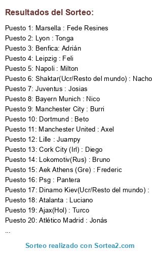 Lista de participantes: Manchester City : Burri, Manchester United : Axel, Liverpool : Sebas, Chelsea : Pablo Cdba, Psg : Pantera, Lyon : Tonga, Lille : Juampy, Marsella : Fede Resines, Barcelona : Rober, Real Madrid : Luis, Atlético Madrid : Jonás, Valencia : Lucas, Inter : Rodrigo, Juventus : Josias, Napoli : Milton, Atalanta : Luciano, Bayern Munich : Nico, Dortmund : Beto, Leipzig : Feli, Frankfurt : Heredia, Ajax(Hol) : Turco, Racow Czestothowa (Pol) : Estani, Lokomotiv(Rus) : Bruno, Spartak Moscu(Rus) : Pato, Cork City (Irl) : Diego, Aek Athens (Gre) : Frederic, Olimpiakos(Gre) : Eze, Panathinakos(Gre) : Caito, Shaktar(Ucr/Resto del mundo) : Nacho, Dinamo Kiev(Ucr/Resto del mundo) : Patro, Porto : Facu, Benfica: Adrián.