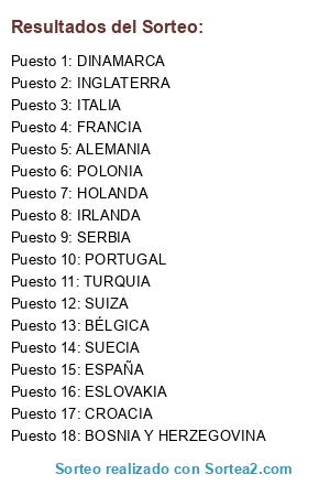 Lista de participantes: CROACIA, ALEMANIA, TURQUIA, ESLOVAKIA, BOSNIA Y HERZEGOVINA, SUIZA, POLONIA, HOLANDA, BÉLGICA, ESPAÑA, PORTUGAL, IRLANDA, INGLATERRA, SERBIA, DINAMARCA, SUECIA, FRANCIA, ITALIA.