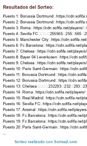 Lista de participantes: Real Madrid https://cdn.sofifa.net/players/ / 25_120.png 239085 239 085 https://cdn.sofifa.net/players/239/085/25_120.png E. Haaland DC, Liverpool https://cdn.sofifa.net/players/ / 25_120.png https://cdn.sofifa.net/players///25_120.png Rodri MCD MC, Roma 209331 209 331 209331 M. Salah, Real Madrid https://cdn.sofifa.net/players/ / 25_120.png https://cdn.sofifa.net/players///25_120.png J. Bellingham MCO MC, Real Madrid https://cdn.sofifa.net/players/ / 25_120.png https://cdn.sofifa.net/players///25_120.png Vini Jr. EI DC, Manchester City https://cdn.sofifa.net/players/ / 25_120.png https://cdn.sofifa.net/players///25_120.png K. De Bruyne MC MCO, Bayer 04 Leverkusen https://cdn.sofifa.net/players/ / 25_120.png https://cdn.sofifa.net/players///25_120.png F. Wirtz MCO, Chelsea https://cdn.sofifa.net/players/ / 25_120.png https://cdn.sofifa.net/players///25_120.png L. Martinez DC, Real Madrid https://cdn.sofifa.net/players/ / 25_120.png https://cdn.sofifa.net/players///25_120.png T. Courtois POR, Chelsea https://cdn.sofifa.net/players/ / 25_120.png https://cdn.sofifa.net/players///25_120.png V. van Dijk DFC, Manchester United https://cdn.sofifa.net/players/ / 25_120.png 188545 188 545 https://cdn.sofifa.net/players/188/545/25_120.png R. Lewandowski DC, Fc Barcelona https://cdn.sofifa.net/players/ / 25_120.png https://cdn.sofifa.net/players///25_120.png M. ter Stegen POR, Liverpool https://cdn.sofifa.net/players/ / 25_120.png https://cdn.sofifa.net/players///25_120.png Alisson POR, Real Madrid https://cdn.sofifa.net/players/ / 25_120.png https://cdn.sofifa.net/players///25_120.png F. Valverde MC MD, Manchester City https://cdn.sofifa.net/players/ / 25_120.png https://cdn.sofifa.net/players///25_120.png C. Palmer MCO MD, Bayer 04 Leverkusen https://cdn.sofifa.net/players/ / 25_120.png https://cdn.sofifa.net/players///25_120.png A. Rüdiger DFC, Arsenal https://cdn.sofifa.net/players/ / 25_120.png 246669 246 669 https://cdn.sofifa.net/players/246/669/25_120.png B. Saka ED MD, Arsenal https://cdn.sofifa.net/players/ / 25_120.png 222665 222 665 https://cdn.sofifa.net/players/222/665/25_120.png M. Ødegaard MC, Manchester City https://cdn.sofifa.net/players/ / 25_120.png https://cdn.sofifa.net/players///25_120.png P. Foden ED EI MCO, Paris Saint-Germain https://cdn.sofifa.net/players/ / 25_120.png 243715 243 715 https://cdn.sofifa.net/players/243/715/25_120.png W. Saliba DFC, Manchester City https://cdn.sofifa.net/players/ / 25_120.png https://cdn.sofifa.net/players///25_120.png Ruben Dias DFC, Manchester City https://cdn.sofifa.net/players/ / 25_120.png https://cdn.sofifa.net/players///25_120.png Theo Bernard François Hernandez, Paris Saint-Germain https://cdn.sofifa.net/players/ / 25_120.png https://cdn.sofifa.net/players///25_120.png G. Donnarumma POR, Paris Saint-Germain https://cdn.sofifa.net/players/ / 25_120.png https://cdn.sofifa.net/players///25_120.png Marquinhos DFC, Arsenal https://cdn.sofifa.net/players/ / 25_120.png 232580 232 580 https://cdn.sofifa.net/players/232/580/25_120.png Gabriel DFC, Paris Saint-Germain https://cdn.sofifa.net/players/ / 25_120.png https://cdn.sofifa.net/players///25_120.png N. Barella MC MCD, Fc Barcelona https://cdn.sofifa.net/players/ / 25_120.png https://cdn.sofifa.net/players///25_120.png J. Musiala MCO MI MC, Real Madrid https://cdn.sofifa.net/players/ / 25_120.png https://cdn.sofifa.net/players///25_120.png J. Tah DFC, Manchester City https://cdn.sofifa.net/players/ / 25_120.png https://cdn.sofifa.net/players///25_120.png Ederson POR, Chelsea 232293 232 293 232293 V. Osimhen, Real Madrid https://cdn.sofifa.net/players/ / 25_120.png https://cdn.sofifa.net/players///25_120.png Rodrygo ED DC, Fc Barcelona https://cdn.sofifa.net/players/ / 25_120.png 251854 251 854 https://cdn.sofifa.net/players/251/854/25_120.png Pedri MC EI, Manchester City https://cdn.sofifa.net/players/ / 25_120.png 233731 233 731 https://cdn.sofifa.net/players/233/731/25_120.png A. Isak, Fc Barcelona https://cdn.sofifa.net/players/ / 25_120.png https://cdn.sofifa.net/players///25_120.png J. Kounde LD DFC, Fc Barcelona https://cdn.sofifa.net/players/ / 25_120.png https://cdn.sofifa.net/players///25_120.png F. de Jong MC MCD, Liverpool https://cdn.sofifa.net/players/ / 25_120.png https://cdn.sofifa.net/players///25_120.png A. Mac Allister MC MCD, Liverpool https://cdn.sofifa.net/players/ / 25_120.png https://cdn.sofifa.net/players///25_120.png T. Alexander-Arnold LD, Manchester City https://cdn.sofifa.net/players/ / 25_120.png https://cdn.sofifa.net/players///25_120.png Bernardo Silva MC ED, Arsenal https://cdn.sofifa.net/players/ / 25_120.png https://cdn.sofifa.net/players///25_120.png Bremer DFC, Borussia Dortmund https://cdn.sofifa.net/players/ / 25_120.png https://cdn.sofifa.net/players///25_120.png G. Kobel POR, Borussia Dortmund https://cdn.sofifa.net/players/ / 25_120.png https://cdn.sofifa.net/players///25_120.png L. Modric MC MCO MCD, Borussia Dortmund https://cdn.sofifa.net/players/ / 25_120.png https://cdn.sofifa.net/players///25_120.png Bruno Fernandes MCO EI MC, Manchester City https://cdn.sofifa.net/players/ / 25_120.png https://cdn.sofifa.net/players///25_120.png Heung-Min Son, Bayer 04 Leverkusen https://cdn.sofifa.net/players/ / 25_120.png https://cdn.sofifa.net/players///25_120.png Grimaldo MI LI, Real Madrid https://cdn.sofifa.net/players/ / 25_120.png https://cdn.sofifa.net/players///25_120.png Carvajal LD, Sevilla FC https://cdn.sofifa.net/players/ / 25_120.png https://cdn.sofifa.net/players///25_120.png K. Benzema, Paris Saint-Germain https://cdn.sofifa.net/players/ / 25_120.png https://cdn.sofifa.net/players///25_120.png O. Dembele ED MCO, Fc Barcelona https://cdn.sofifa.net/players/ / 25_120.png https://cdn.sofifa.net/players///25_120.png Raphinha ED EI MD, Paris Saint-Germain https://cdn.sofifa.net/players/ / 25_120.png https://cdn.sofifa.net/players///25_120.png Vitinha MC MCD, Fc Barcelona https://cdn.sofifa.net/players/ / 25_120.png ht