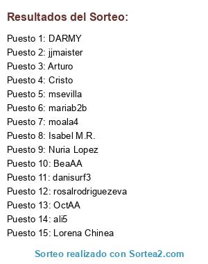 Lista de participantes: DARMY (2 participaciones), jjmaister (2 participaciones), msevilla (2 participaciones), mariab2b (2 participaciones), Nuria Lopez (2 participaciones), rosalrodriguezeva (2 participaciones), Lorena Chinea (2 participaciones), ali5 (2 participaciones), Isabel M.R. (2 participaciones), Cristo , danisurf3 , moala4 , Arturo , OctAA , BeaAA.