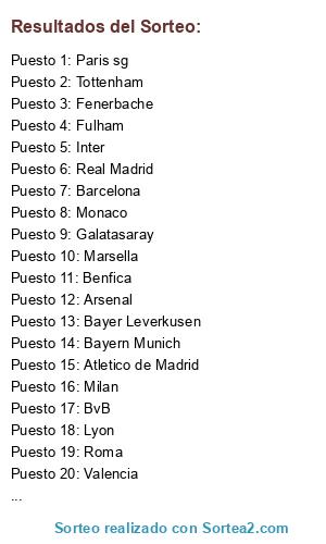 Lista de participantes: Real Madrid, Barcelona, Atletico de Madrid, Sevilla, Valencia, Chelsea, Liverpool, Arsenal, Tottenham, Man City, Man United, Fulham, Everton, BvB, Bayern Munich, Bayer Leverkusen, Schalke 04, Milan, Roma, Napoli, Inter, Juventus, Fiorentina, Paris sg, Monaco, Marsella, Lyon, Shaktar , Fenerbache, Galatasaray, Porto, Benfica.