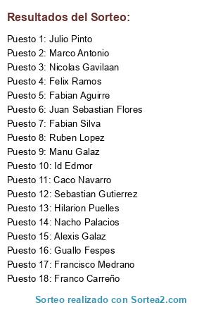 Lista de participantes: Ruben Lopez, Fabian Aguirre, Franco Carreño, Hilarion Puelles, Marco Antonio, Guallo Fespes, Sebastian Gutierrez, Fabian Silva, Alexis Galaz, Juan Sebastian Flores, Nacho Palacios, Felix Ramos, Id Edmor, Manu Galaz, Caco Navarro, Francisco Medrano, Nicolas Gavilaan, Julio Pinto.