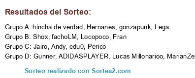 Lista de participantes: ADIDASPLAYER, edu0, Perico, Gunner, Lega, hincha de verdad, Shox, gonzapunk, Jairo, Lucas Millonarioo, Andy, Locopoco, Hernanes, Fran, MarianZep, fachoLM.