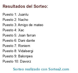 Lista de participantes: Amigo de mateo, Balonpes, Dani dante, Davorz, Joan farran, Juanlu, Nacho, Roniem, Vidalsergi, Xac.