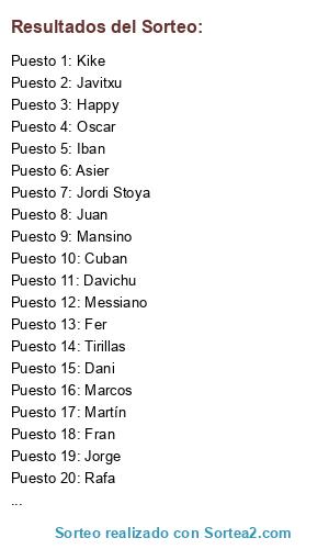 Lista de participantes: Kike, Martín, Happy, Davichu, Jordi Stoya, Cuban, Marcos, Rafa, Jorge, Jordi25, Iban, Mansino, Cabeza, Dani, Messiano, Fran, Fer, Oscar, Asier, Juan, Tirillas, Jhoel, Mundo, Javitxu.
