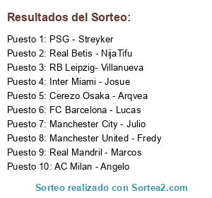 Lista de participantes: FC Barcelona - Lucas, Manchester City - Julio, Manchester United - Fredy, Inter Miami - Josue, RB Leipzig- Villanueva, PSG - Streyker, AC Milan - Angelo, Real Betis - NijaTifu, Real Mandril - Marcos, Cerezo Osaka - Arqvea.