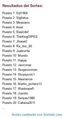Lista de participantes: Happy, Juanito, Messiano, Asier, Mundo, Dzl1904, Javiixu14, Davichu, Serpau1980, Raulcdsf, Ra_doc_60, Jhoeel2, Jualzurita, Martin_portero13, Wantxope9, Stoyayuvic1, Zuri_25, Rafa10_87, Javicorao, Cabeza2011, Sigfridus, Javimetal, TheKingOfPES, El_mansino, Sergioconrom, Alexramos.