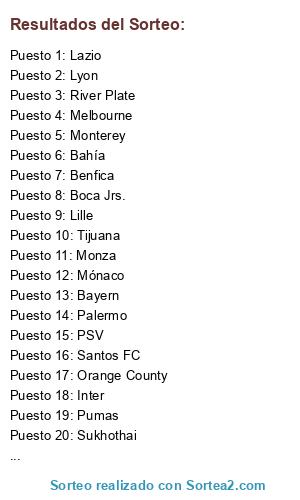 Lista de participantes: Santos FC, Napoli, Ajax, Red Bull, Juárez, Young Boys, Manchester Utd, River Plate, Orange County, Benfica, Mónaco, Melbourne, Inter, Galatasaray, Sparta, Colorado Springs, Bayern, Roma, Bahía, PSV, Barcelona, Lazio, Porto, Besiktas, Boca Jrs., Lille, Miami, Monterey, Marsella, Rangers, Palermo, Tigres, Lyon, Pumas, Monza, Arsenal, AC Milan, Tijuana, Sukhothai.